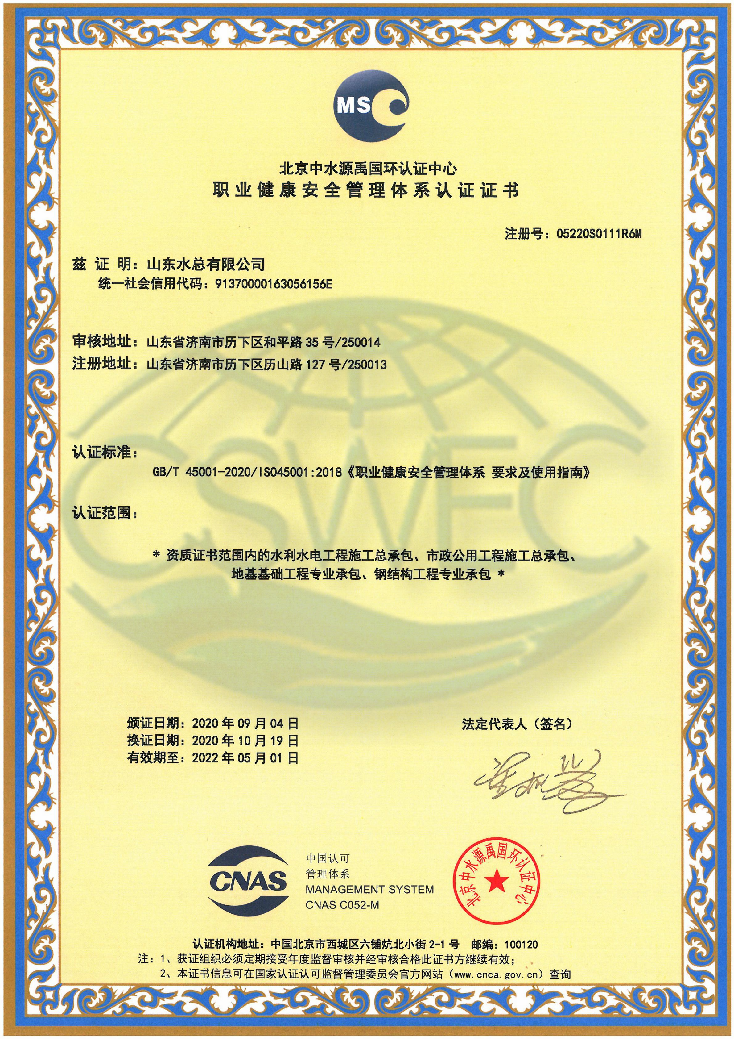 職業(yè)健康安全管理體系認(rèn)證證書(shū)